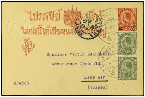 1908 Postal stationary card 2 att on 1 1/2 att red upgraded for mail to FRANCE with 1 att green (pair) (SG 67) tied by bilingual BANGKOK 2 cds with FRENCH arrival. Superb.