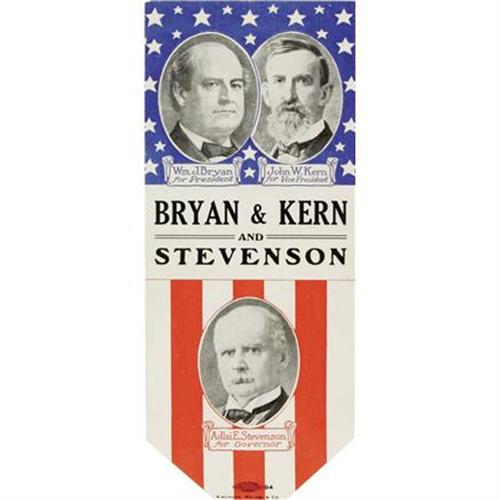 <B>Fantastic Large, Colorful 1908 Ribbon Featuring the Presidential Ticket of Bryan & Kern, Plus 1900 Presidential Candidate Adlai Stevenson for Governor of Illinois.</B></I> If there is another campaign item which pictures all three of these Democratic giants, we cannot recall having seen it! This bold red, white, and blue ribbon is formed of a paper layer adhered to a textured fabric backing. Condition is beautiful. 3.25" x 7.75". <I>From the Norman Loewenstern Collection.</B></I>