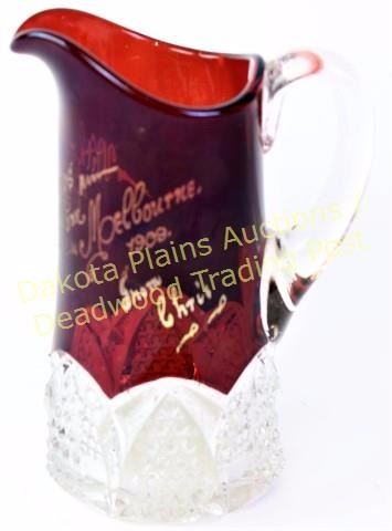 1908 Ruby flashed glass pitcher with inscription Greeting from Melbourne 1908. Above average size in the classic Button Arches pattern, C. 1897-1920. Excellent condition, 7" tall. Est. 125-200with inscription Greeting from Melbourne 1908. Above average size in the classic Button Arches pattern, C. 1897-1920. Excellent condition, 7" tall. Est. 125-200