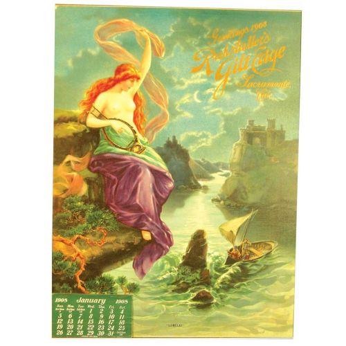 1908 Calendar for Ruhstallers Brewery, Sacramento, Cal. Entitled Lorelei with embossed lettering. Original bands top and bottom, near mint condition. 15 X 20 inches image only.