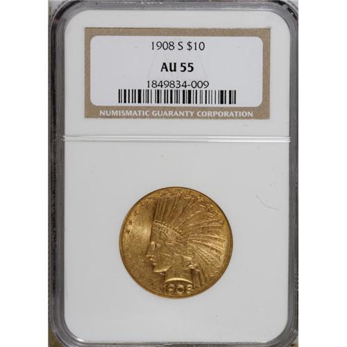 1908-S $10 AU55 NGC. Fewer than 60,000 pieces were str