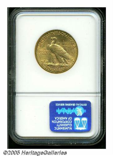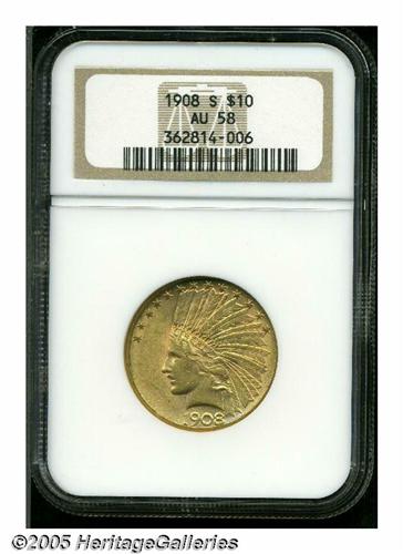<B>1908-S<$10> AU58 NGC.</B></I> Peach-gold surfaces display nice remaining luster. The design features are well struck, though the eagle's left shoulder is weak. A few light contact marks are noted on the Indian's cheek and in the left (facing) reverse field.