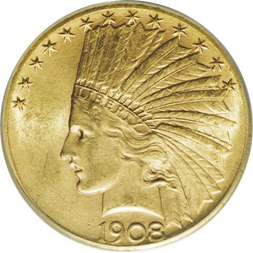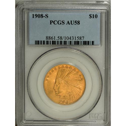 <B>1908-S $10 AU58 PCGS.</B></I> This lightly circulated 1908-S ten dollar displays honey-gold patination and nice luster on fine-grained surfaces. The design elements are well impressed, with nice definition apparent in the Indian's hair and in the feathers of the bonnet. Both sides are quite clean, revealing no marks worthy of individual mention.<BR><BR><b>Shipping:</b> Coin/Currency (<a target="_blank" href="http://www.heritageauctions.com/common/shipping.php">view shipping information</a>)