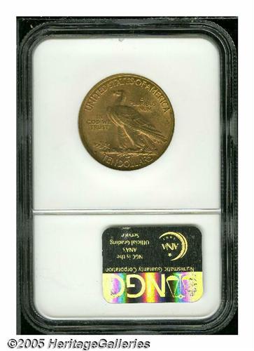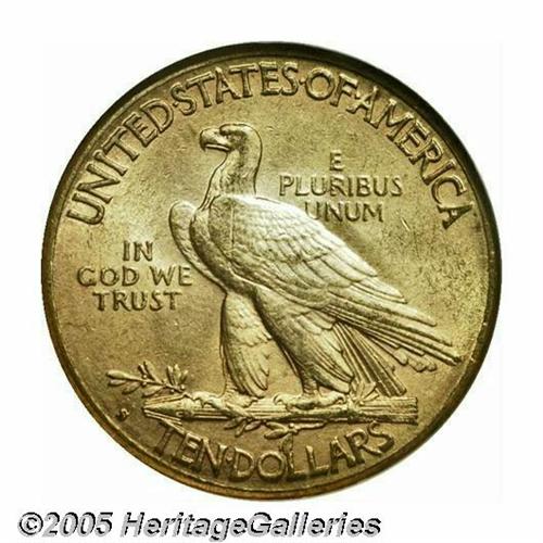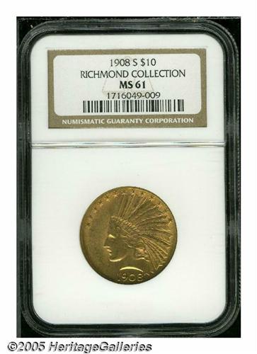 <B>1908-S<$10> MS61 NGC.</B></I> Ex: Richmond Collection. The 1908-S has a mintage of less than 60,000 pieces, and like all S-mint Indian Half Eagles, it is conditionally elusive in Uncirculated grades. This original example has unbroken cartwheel luster and a good strike. A small handling mark is concealed within the headdress, and an interesting mint-made staple-shaped strike-thru is on the eagle's wing.