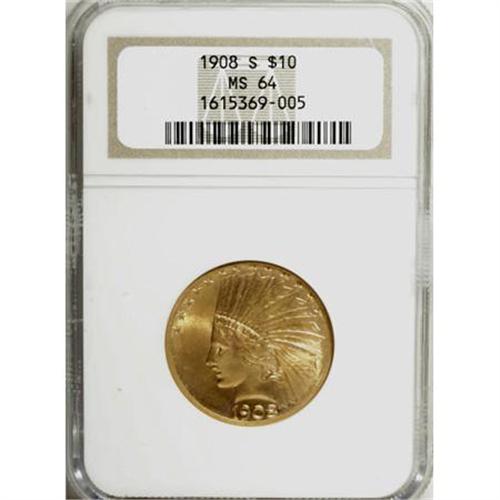 <B>1908-S $10 MS64 NGC.</B></I> While Garrett and Guth (2006) characterize this issue as available in grades from MS65 through MS67, examining the combined certified population reveals that Choice pieces are elusive, and Gem and better pieces are condition rarities. Combined with the small mintage of just 59,850 pieces, it is little wonder that the 1908-S is coveted in pleasing Mint State.<BR> This fascination near-Gem has eye appeal in spades, with flashy lemon-gold fields that show elements of orange and honey at the reverse margins. The obverse has excellent detail for the issue, and a touch of softness on the eagle's wing and leg is of little concern. A faint mark on Liberty's cheek and minor, scattered flaws account for the grade.<BR><I>From The Parker Lee III Collection.</B></I><BR><BR><B>Coin Engraver:</B> Augustus Saint-Gaudens<BR><BR><b>Shipping:</b> Coins & Currency (<a target="_blank" href="http://www.heritageauctions.com/common/shipping.php">view shipping information</a>)