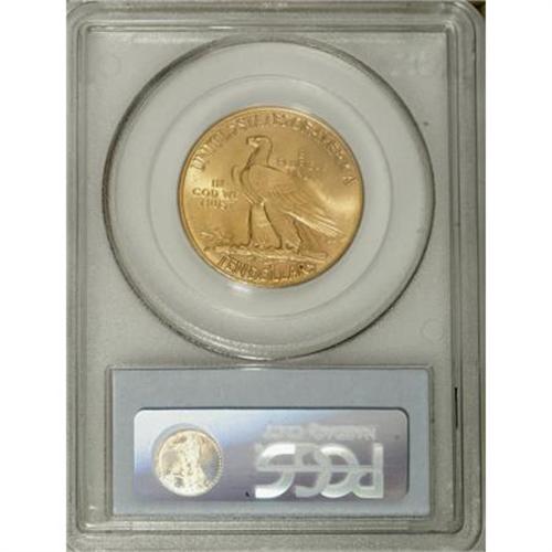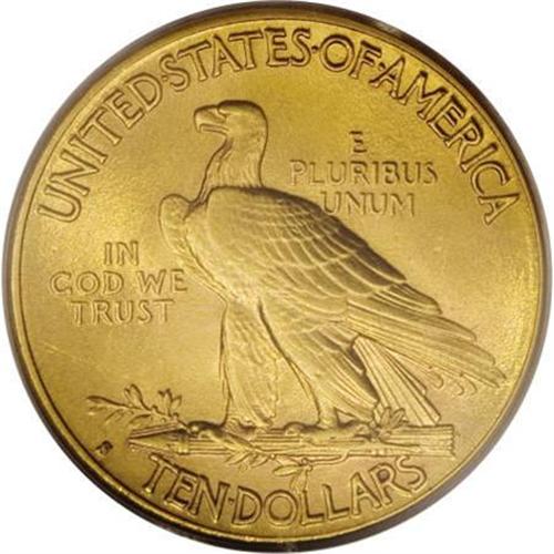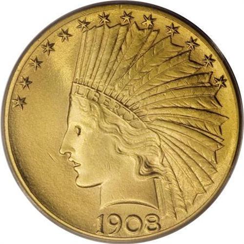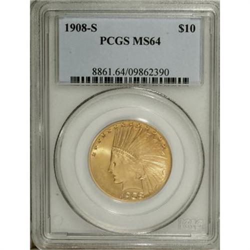 <B>1908-S $10 MS64 PCGS.</B></I> The 1908-S is one of the most popular issues in the ten dollar Indian series, primarily because of the impressively low mintage of only 59,850 pieces. Examples are surprisingly available, however, with a number of pieces available even in MS67 and 68 grades. That is not to say it is a common issue in MS64, as only two dozen pieces have been so graded by PCGS, but it was apparently saved in small numbers at the time of issue and several of the better (MS64 and finer) coins come from two small hoards found in Europe. <BR> This piece shows the excellent luster this issue is so well known for--bright and frosted with even yellow-gold color. Sharply defined on the obverse with just a bit of weakness noted on the upper portion of the eagle's wing on the reverse. The only grade-limiting mark is a slight, angling abrasion in the left obverse field. An impressive example of this important and popular early ten Indian.<BR><I>From The Carlton Woods Collection.</B></I><BR><BR><B>Coin Engraver:</B> Augustus Saint-Gaudens<BR><BR><b>Shipping:</b> Coins & Currency (<a target="_blank" href="http://www.heritageauctions.com/common/shipping.php">view shipping information</a>\)