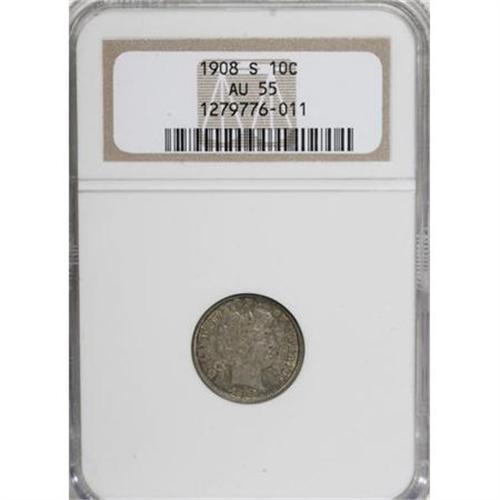 <B>1908-S 10C AU55 NGC.</B></I> NGC Census: (2/59). PCGS Population (8/90). Mintage: 3,220,000. Numismedia Wsl. Price for NGC/PCGS coin in AU55: $146. (#4849)<BR><BR><B>Coin Engraver:</B> Charles E. Barber<BR><BR><b>Shipping:</b> Coins & Currency (<a target="_blank" href="http://www.heritageauctions.com/common/shipping.php">view shipping information</a>)