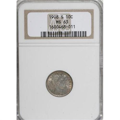<B>1908-S 10C MS63 NGC.</B></I> NGC Census: (13/31). PCGS Population (9/53). Mintage: 3,220,000. Numismedia Wsl. Price for NGC/PCGS coin in MS63: $520. (#4849)<BR><BR><B>Coin Engraver:</B> Charles E. Barber<BR><BR><b>Shipping:</b> Coins & Currency (<a target="_blank" href="http://www.heritageauctions.com/common/shipping.php">view shipping information</a>)