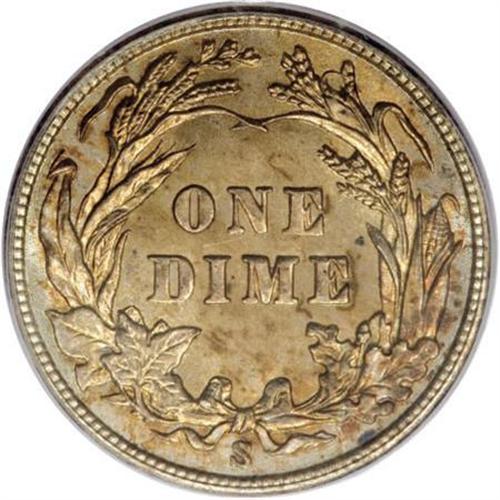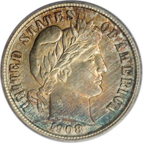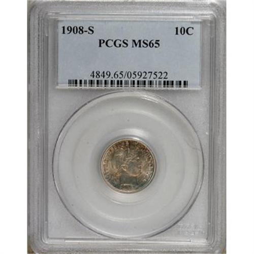 <B>1908-S 10C MS65 PCGS.</B></I> Low to medium intensity cobalt-blue, lavender, and golden-brown patination rides over the obverse, while light gold-tan color dominates the reverse, which is framed by russet and light blue at the periphery. Sharply struck throughout. A couple of minor obverse marks are within the confines of the grade designation. Population: 16 in 65, 10 finer (6/07).<BR><BR><b>Shipping:</b> Coins & Currency (<a target="_blank" href="http://www.heritageauctions.com/common/shipping.php">view shipping information</a>)