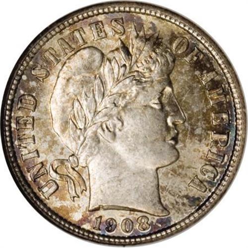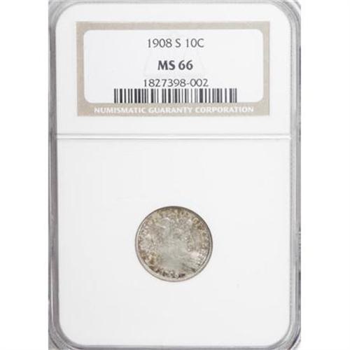 <B>1908-S 10C MS66 NGC.</B></I> While the 1908-S Barber dime is not considered a rarity, it is seldom seen in grades as fine as this. In fact, this Premium Gem is tied for the finest that NGC has certified. Both sides have pale ivory color that is accompanied by deeper gold and iridescent toning. All aspects of the design are bold. Census: 3 in 66, 0 finer (6/07).<BR><BR><b>Shipping:</b> Coins & Currency (<a target="_blank" href="http://www.heritageauctions.com/common/shipping.php">view shipping information</a>)