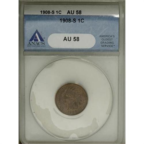 <B>1908-S 1C AU58 ANACS.</B></I> NGC Census: (71/242). PCGS Population (78/124). Mintage: 1,115,000. Numismedia Wsl. Price for NGC/PCGS coin in AU58: $175. (#2232)<BR><BR><B>Coin Engraver:</B> James B. Longacre<BR><BR><b>Shipping:</b> Coins & Currency (<a target="_blank" href="http://www.heritageauctions.com/common/shipping.php">view shipping information</a>)