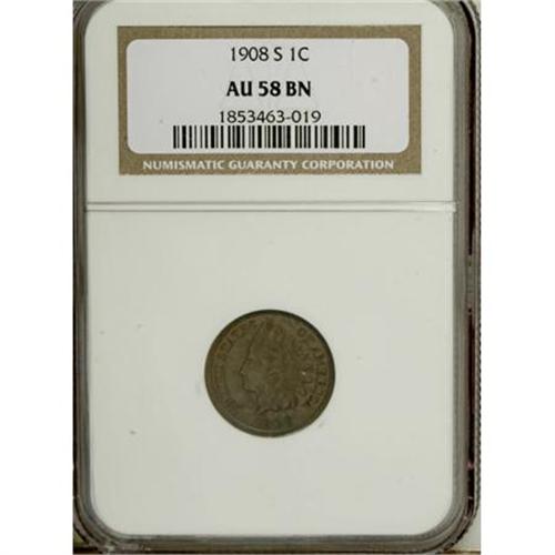 <B>1908-S 1C AU58 NGC.</B></I> NGC Census: (65/236). PCGS Population (72/120). Mintage: 1,115,000. Numismedia Wsl. Price for NGC/PCGS coin in AU58: $171. (#2232)<BR><BR><B>Coin Engraver:</B> James B. Longacre<BR><BR><b>Shipping:</b> Coins & Currency (<a target="_blank" href="http://www.heritageauctions.com/common/shipping.php">view shipping information</a>\)