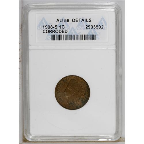 <B>1908-S 1C --Corroded--ANACS. AU58 Details.</B></I> NGC Census: (63/233). PCGS Population (67/115). Mintage: 1,115,000. Numismedia Wsl. Price: $154. (#2232)<BR><BR><b>Shipping:</b> Coins & Currency (<a target="_blank" href="http://www.heritageauctions.com/common/shipping.php">view shipping information</a>)