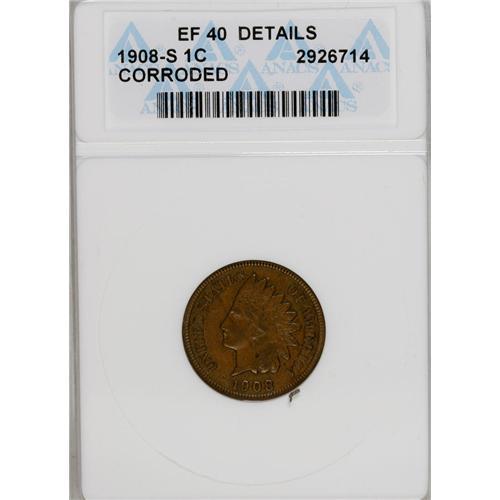 <B>1908-S 1C --Corroded--ANACS. XF40 Details.</B></I> NGC Census: (38/391). PCGS Population (52/339). Mintage: 1,115,000. Numismedia Wsl. Price: $108. (#2232)<BR><BR><b>Shipping:</b> Coins & Currency (<a target="_blank" href="http://www.heritageauctions.com/common/shipping.php">view shipping information</a>)