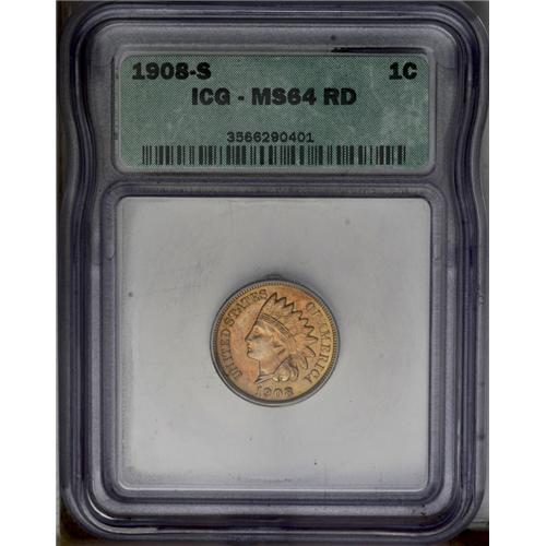 1908-S 1C MS64 Red ICG. This semi-key representative e 1908-S[1C] MS64 Red ICG.