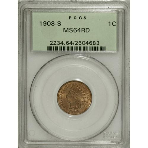 <B>1908-S 1C MS64 Red PCGS.</B></I> The 1908-S and 1909-S are growing increasingly popular among the increasing numbers of Indian cent collectors, and that demand is likely to explode in a couple of years when the Mint releases the special 1909-2009 commemorative Lincoln cents. This lustrous near-Gem that has a typical strike and a few flecks of patina on the obverse. The reverse is especially pleasing. Certified in a green-label holder.<BR><BR><b>Shipping:</b> Coins & Currency (<a target="_blank" href="http://www.heritageauctions.com/common/shipping.php">view shipping information</a>)