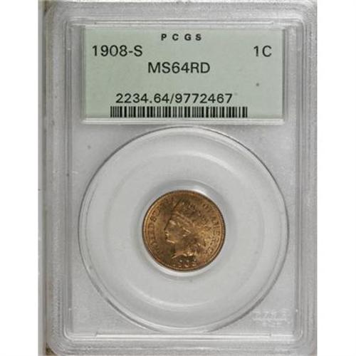 <B>1908-S 1C MS64 Red PCGS.</B></I> Pale straw-pink and deeper copper-gold shadings grace this mintmarked near-Gem. Well-defined by the standards of this San Francisco issue with only a few scattered marks that preclude a finer designation.<BR><BR><B>Coin Engraver:</B> James B. Longacre<BR><BR><b>Shipping:</b> Coins & Currency (<a target="_blank" href="http://www.heritageauctions.com/common/shipping.php">view shipping information</a>)