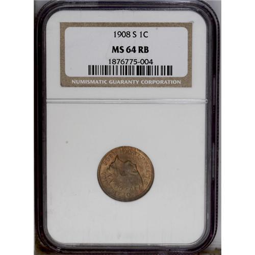 <B>1908-S<1C> MS64 Red and Brown NGC.</B></I> Fully lustrous with the streaky patina that often accompanies Mint State representatives of this first-year S-mint issue. Suitably struck and typically soft on the feather tips of the headdress with no noticeable detractions on either side. <BR><BR><B>Important notice:</B> Heritage usually auctions material at the rate of 200-250 lots per hour. On some occasions eBay Live bid software or the Internet may not be able to keep up with the pace of the auction. We recommend placing a realistic absentee bid now as insurance to avoid disappointment. Occasionally the auctioneer may eliminate or reject an eBay Live bid, and the auctioneer may also reopen a lot after the close of the eBay live bidding (usually because we missed an audience bid), and may reject your bid even if it shows you as the winning bidder. By bidding via eBay Live, you agree that Heritage may award the lot to another bidder at its sole discretion under the circumstances described above or any other reasonable circumstances. Since eBay bids are not shown to us until we open the lot on the floor, we treat those bids just like floor bids. In most cases the floor responds before the eBay bid is presented to us, due to Internet lag time, so for consistency we have made it a policy that floor bids are always considered first over tie eBay live bids. Also please note that all Heritage lots purchased through eBay Live carry a 20% Buyer's Premium. Please make sure you read the Terms and Conditions before you bid. This lot is being auctioned in conjunction with a live floor auction by Heritage Galleries & Auctioneers. All final auction and invoice information will be supplied by Heritage Galleries & Auctioneers, and all other information should be considered preliminary. Lot:423 <BR><BR><B>Winning Notification and Billing:</B> After the FINAL session in this auction is complete, Heritage will send e-mail and snail mail invoices. This process normally takes several days. All final auction and invoice information will be supplied by Heritage Galleries & Auctioneers, and all other information should be considered preliminary. <BR><BR>This auction will be conducted on a live auction floor and over the Internet through eBay Live. If you choose to place an absentee bid, please take a moment to <font color='#0000ff'><u><a href='http://pages.ebay.com/liveauctions/help/before/laabsentee.html'>learn how eBay Live absentee bidding works</a></u></font><font color='#000000'>