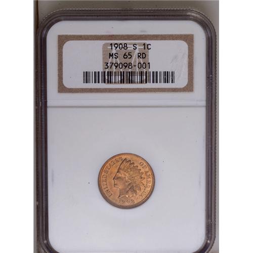 <B>1908-S<1C> MS65 Red NGC.</B></I> Attractive, high grade survivors of this first-year San Francisco Mint production are anything but common in today's market. Actually, the '08-S (1.1 million pieces produced) is a semi-key issue at all levels of preservation. Typically struck with well preserved surfaces that exhibit unmellowed tan-gold and peach coloration. One shallow mark is noted to the left of Liberty's ear. Beautiful shimmering luster is seen on both sides. Census: 85 in 65 Red, 22 finer (7/06).<BR><I>From The Tigard Oregon Small Cent Collection.</B></I> <BR><BR><B>Important no