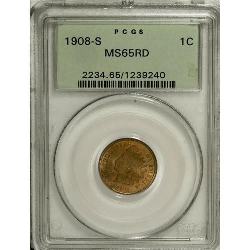 <B>1908-S 1C MS65 Red PCGS.</B></I> A pale gold Gem that has glimpses of rose-red and a blush of olive-gray near UNITED and the arrow shafts. The strike is crisp save for the tips of the upper headdress feathers. An unabraded and lustrous example of this low mintage collector favorite. Housed in a green label holder.<BR><BR><b>Shipping:</b> Coins & Currency (<a target="_blank" href="http://www.heritageauctions.com/common/shipping.php">view shipping information</a>)