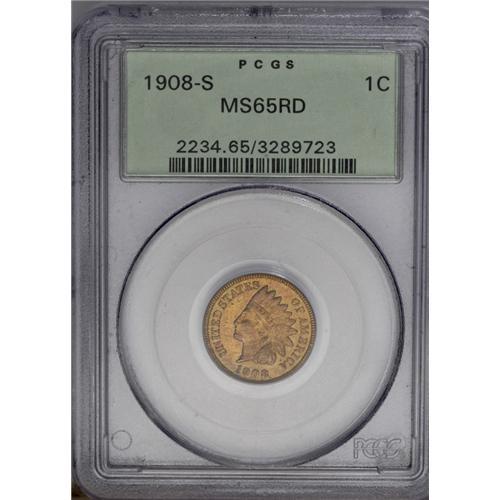 1908-S 1C MS65 Red PCGS. Bright, even, orange-red colo
