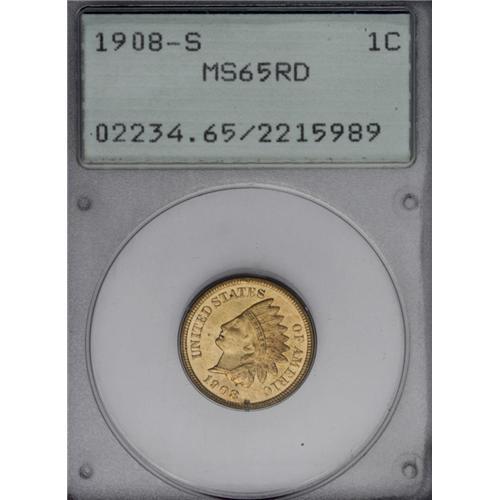 <B>1908-S<1C> MS65 Red PCGS.</B></I> Fully brilliant with frosty yellow luster and reasonably sharp design elements, save for the feather tips that are slightly weak. Some light specks are noted on both sides. This is a lovely Gem example of the first San Francisco Mint minor denomination coin. <BR><BR><B>Important notice:</B> Heritage usually auctions material at the rate of 200-250 lots per hour. On some occasions eBay Live bid software or the Internet may not be able to keep up with the pace of the auction. We recommend placing a realistic absentee bid now as insurance to avoid disappointment. Occasionally the auctioneer may eliminate or reject an eBay Live bid, and the auctioneer may also reopen a lot after the close of the eBay live bidding (usually because we missed an audience bid), and may reject your bid even if it shows you as the winning bidder. By bidding via eBay Live, you agree that Heritage may award the lot to another bidder at its sole discretion under the circumstances described above or any other reasonable circumstances. Since eBay bids are not shown to us until we open the lot on the floor, we treat those bids just like floor bids. In most cases the floor responds before the eBay bid is presented to us, due to Internet lag time, so for consistency we have made it a policy that floor bids are always considered first over tie eBay live bids. Also please note that all Heritage lots purchased through eBay Live carry a 20% Buyer's Premium. Please make sure you read the Terms and Conditions before you bid. This lot is being auctioned in conjunction with a live floor auction by Heritage Galleries & Auctioneers. All final auction and invoice information will be supplied by Heritage Galleries & Auctioneers, and all other information should be considered preliminary. Lot:426 <BR><BR><B>Winning Notification and Billing:</B> After the FINAL session in this auction is complete, Heritage will send e-mail and snail mail invoices. This process normally takes several days. All final auction and invoice information will be supplied by Heritage Galleries & Auctioneers, and all other information should be considered preliminary. <BR><BR>This auction will be conducted on a live auction floor and over the Internet through eBay Live. If you choose to place an absentee bid, please take a moment to <font color='#0000ff'><u><a href='http://pages.ebay.com/liveauctions/help/before/laabsentee.html'>learn how eBay Live absentee bidding works</a></u></font><font color='#000000'>