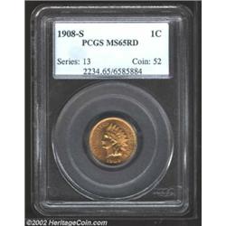 1908-S 1C MS65 Red PCGS. Glowing, orange-red surfaces are bathed in fulsome mint luster. Free of toning, outwardly distracting carbon, and bothersome abrasions, this coin is certainly knocking on the door of an even higher grade. A trio of faint swirls in the left obverse field before Liberty's nose are noted solely for accuracy.From the "Newmismatist" Collection. Important notice: We expect to be auctioning lots at the rate of 200-250 per hour. Sometimes eBay Premier live bid software cannot keep up with that pace, so we strongly recommend that you place a realistic proxy bid now as insurance to avoid disappointment. Also please note that all Heritage/CAA lots purchased through eBay Premier carry a 20% Buyer's Premium. Please make sure you read the Terms and Conditions.