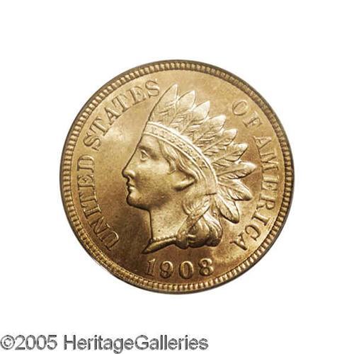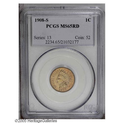 <B>1908-S<1C> MS65 Red PCGS.</B></I> This is an uncommonly well produced representative of this low mintage (1.1 million pieces), semi-key issue. The planchet was well prepared with the result that the surfaces display overall even color in reddish-golden hues. Other than the feather tips, there are virtually no ill-defined features, and there is virtually no carbon on either the obverse or reverse. The San Francisco Mint mated six obverse dies with five reverses to produce this issue.