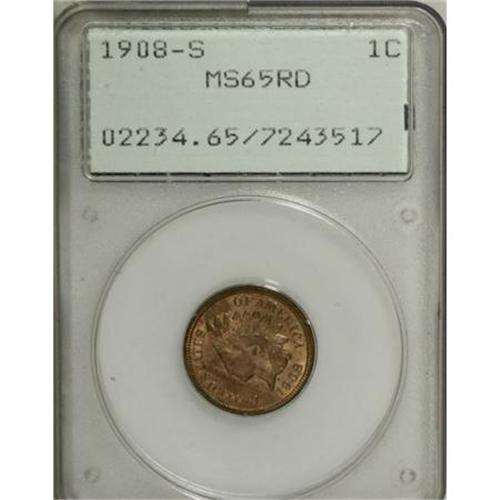<B>1908-S 1C MS65 Red PCGS.</B></I> The tan-gold surfaces of this piece show a patch of smoke-gray toning on the obverse, but elsewhere the coin is well within the confines of the Red designation. This underrated issue is popular as the first S-mint cent, marking an end to the Philadelphia Mint's 115-year monopoly on copper coinage. Somewhat softly struck on the lower ribbons on each side, and certified in a first-generation small holder. PCGS has graded only 34 coins finer (7/07).<BR><BR><B>Coin Engraver:</B> James B. Longacre<BR><BR><b>Shipping:</b> Coins & Currency (<a target="_blank" href="http://www.heritageauctions.com/common/shipping.php">view shipping information</a>\)
