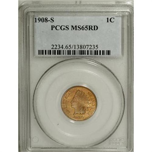 <B>1908-S 1C MS65 Red PCGS.</B></I> The first thing one notices about this coin is its extraordinary sharpness. The tips of the feathers in the headdress show almost complete definition, comparable to that seen on Philadelphia coins. The color is a bright red with an undertone of orange. Nearly free from carbon also. A remarkable coin for the issue that will surely appeal to an advanced and knowledgeable collector.<BR><BR><B>Coin Engraver:</B> James B. Longacre<BR><BR><b>Shipping:</b> Coins & Currency (<a target="_blank" href="http://www.heritageauctions.com/common/shipping.php">view shipping information</a>\)