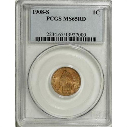 <B>1908-S 1C MS65 Red PCGS.</B></I> The bright mint-red surfaces reveal some speckled green and amber patina. The design elements are crisply rendered, except for the tips of the upper headdress feathers. The reverse is well preserved, while the obverse has a few tiny, non-distracting marks. An exceptionally attractive Gem example of this scarce and popular semi-key date.<BR><BR><B>Coin Engraver:</B> James B. Longacre<BR><BR><b>Shipping:</b> Coins & Currency (<a target="_blank" href="http://www.heritageauctions.com/common/shipping.php">view shipping information</a>)