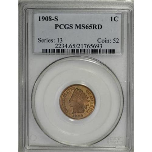 <B>1908-S 1C MS65 Red PCGS.</B></I> This scarce, semi-key issue is usually seen with soft definition on the tips of the feathers of the headdress, but on this piece that area of the coin is almost fully defined. The rich red mint luster shows the slightest tinge of olive on the reverse, and there are no distracting abrasions or spots of carbon on either side.<BR><BR><B>Coin Engraver:</B> James B. Longacre<BR><BR><b>Shipping:</b> Coins & Currency (<a target="_blank" href="http://www.heritageauctions.com/common/shipping.php">view shipping information</a>)