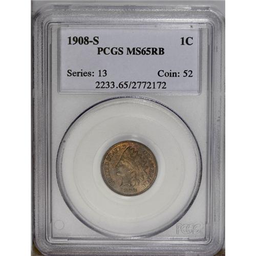<B>1908-S<1C> MS65 Red and Brown PCGS.</B></I> A beautiful Gem of this historic, low mintage issue. The undisturbed surfaces display variegated orange-gold, ruby, and cobalt-blue patination. <BR><BR><B>Important notice:</B> Heritage usually auctions material at the rate of 200-250 lots per hour. On some occasions eBay Live bid software or the Internet may not be able to keep up with the pace of the auction. We recommend placing a realistic absentee bid now as insurance to avoid disappointment. Occasionally the auctioneer may eliminate or reject an eBay Live bid, and the auctioneer may also reopen a lot after the close of the eBay live bidding (usually because we missed an audience bid), and may reject your bid even if it shows you as the winning bidder. By bidding via eBay Live, you agree that Heritage may award the lot to another bidder at its sole discretion under the circumstances described above or any other reasonable circumstances. Since eBay bids are not shown to us until we open the lot on the floor, we treat those bids just like floor bids. In most cases the floor responds before the eBay bid is presented to us, due to Internet lag time, so for consistency we have made it a policy that floor bids are always considered first over tie eBay live bids. Also please note that all Heritage lots purchased through eBay Live carry a 20% Buyer's Premium. Please make sure you read the Terms and Conditions before you bid. This lot is being auctioned in conjunction with a live floor auction by Heritage Galleries & Auctioneers. All final auction and invoice information will be supplied by Heritage Galleries & Auctioneers, and all other information should be considered preliminary. Lot:424 <BR><BR><B>Winning Notification and Billing:</B> After the FINAL session in this auction is complete, Heritage will send e-mail and snail mail invoices. This process normally takes several days. All final auction and invoice information will be supplied by Heritage Galleries & Auctioneers, and all other information should be considered preliminary. <BR><BR>This auction will be conducted on a live auction floor and over the Internet through eBay Live. If you choose to place an absentee bid, please take a moment to <font color='#0000ff'><u><a href='http://pages.ebay.com/liveauctions/help/before/laabsentee.html'>learn how eBay Live absentee bidding works</a></u></font><font color='#000000'>
