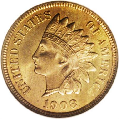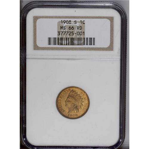 <B>1908-S<1C> MS66 Red NGC.</B></I> The 1908-S is a rare coin in the context of the Indian cent series, and considerably rarer in high grades than the 1909-S, VDB Lincoln cent (although demand is less). The surfaces are nearly carbon-free and show even, unmellowed, original reddish-orange color in this attractive Premium Gem. Only minor softness shows on the feather tips, usually an area of noticeable weakness on this branch mint issue. Census: 22 in 66, 0 finer (8/06).