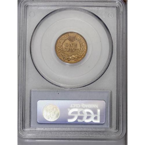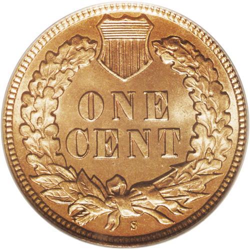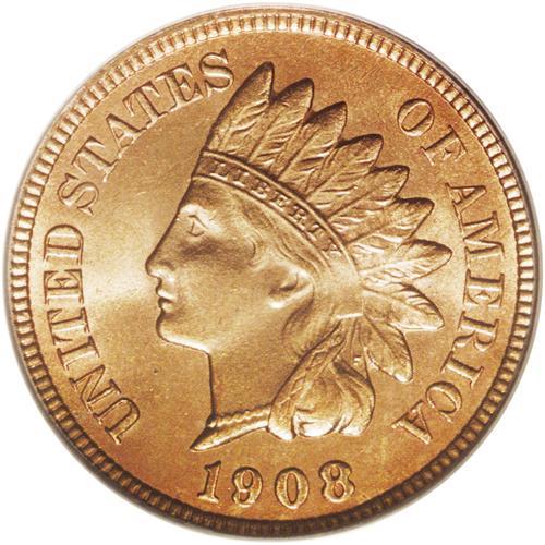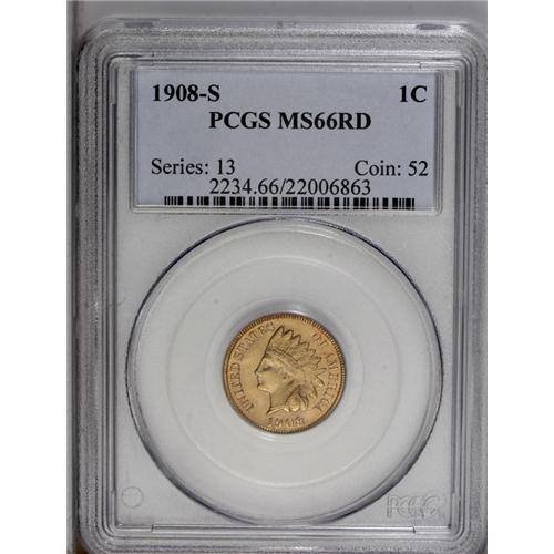 <B>1908-S<1C> MS66 Red PCGS.</B></I> Judging from the population data, the 1908-S and 1909-S Indian cents are about equal in rarity in high grades with full red color, and both are much, much rarer than the 1909-S, VDB cent in such condition. Although the 1908-S was probably saved to some degree as the first mintmarked cent, the 1909-S Indian was saved as the last of the series (and the general collecting public saved many more SVDBs as a novel new design). The San Francisco cents of 1908 and 1909 were struck on lighter-colored planchets than earlier cent issues. This example offers lovely, original surfaces of tan-gold. While the strike atop the headdress feather is not razor-sharp, this piece is completely unafflicted by carbon. One of the finest graded at PCGS. Population: 31 in 66, 0 finer (7/06).