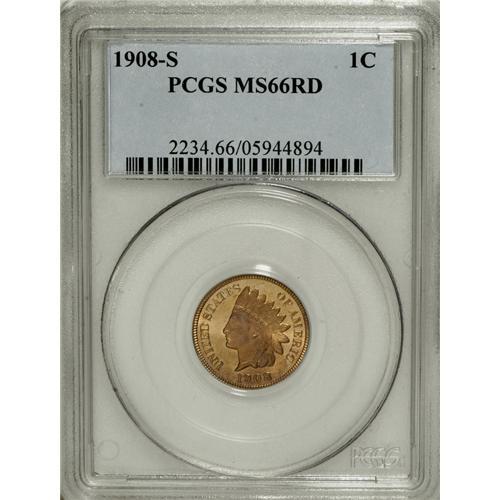 <B>1908-S 1C MS66 Red PCGS.</B></I> This is a truly lovely Indian cent that displays beautiful lime-green and peach toning on both sides. The fields are semi-reflective and clean, with just one tiny contact mark noted on the lower reverse, below N in CENT. This was the first year of cent coinage at the San Francisco Mint, and the third-lowest circulation strike mintage of the series at 1,115,000 pieces. PCGS Population: 34 in 66 Red, 0 finer at either service (3/07).<BR><BR><b>Shipping:</b> Coins & Currency (<a target="_blank" href="http://www.heritageauctions.com/common/shipping.php">view shipping information</a>)