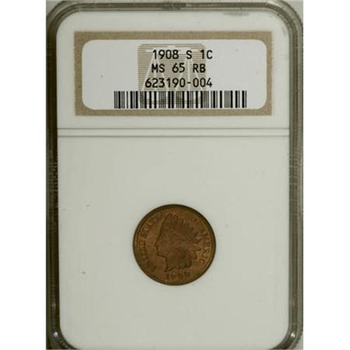 <B>1908-S 1C MS65 Red and Brown NGC.</B></I> NGC Census: (113/9). PCGS Population (78/3). Mintage: 1,115,000. Numismedia Wsl. Price for NGC/PCGS coin in MS65: $900. (#2233)<BR><BR><B>Coin Engraver:</B> James B. Longacre<BR><BR><b>Shipping:</b> Coins & Currency (<a target="_blank" href="http://www.heritageauctions.com/common/shipping.php">view shipping information</a>)