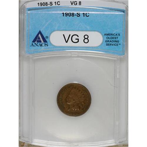 <B>1908-S 1C VG8 ANACS.</B></I> NGC Census: (6/546). PCGS Population (6/600). Mintage: 1,115,000. Numismedia Wsl. Price for NGC/PCGS coin in VG8 : $51. (#2232)<BR><BR><b>Shipping:</b> Coins & Currency (<a target="_blank" href="http://www.heritageauctions.com/common/shipping.php">view shipping information</a>)