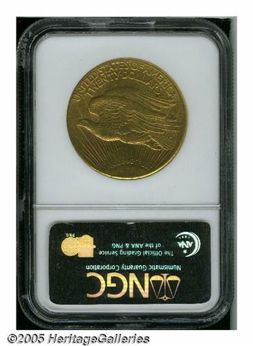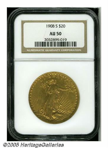 <B>1908-S<$20> AU50 NGC.</B></I> Muted luster and moderate highpoint wear accompany the red-gold surfaces of this first year San Francisco issue of the Saint-Gaudens design type. The 1908-S is one of the rarest issues in the series. Not only does it have a very low mintage of only 22,000 pieces (second only to the 1907 High Relief), but it is also scarce in all grades.