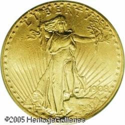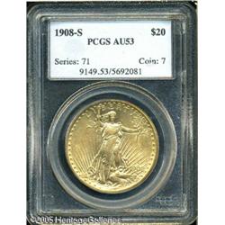<B>1908-S $20 AU53 PCGS.</B></I> A scarce date for the collector who needs this issue. The surfaces are attractive for the grade, with most of the luster present and minimal wear on the high points of the design.<BR><I>From The Mike Jacobson Collection.</B></I> Lot:9483
