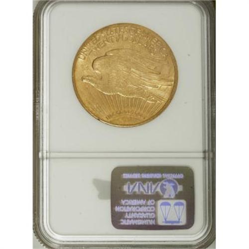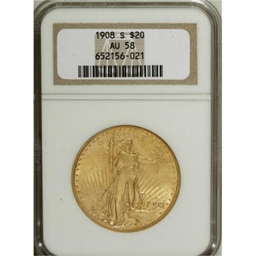 <B>1908-S $20 AU58 NGC.</B></I> This low-mintage issue is usually found in circulated or low Mint State grades, with most pieces averaging about Choice AU. This near-Mint State piece features the gorgeous luster characteristic of the issue, with light abrasions and wear attesting to a short spate in circulation. Good value for the AU58 grade.<BR><BR><b>Shipping:</b> Coins & Currency (<a target="_blank" href="http://www.heritageauctions.com/common/shipping.php">view shipping information</a>)
