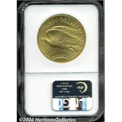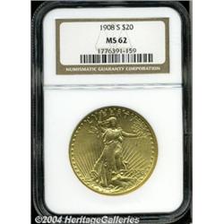 <B>1908-S<$20> MS62 NGC.</B></I> The surfaces are somewhat matte-like, and emit a soft, glowing luster beneath honey-gold patination. The design features are well impressed throughout. A few light to moderate abrasions are seen on Liberty's right leg above the knee, and on the left leg.<BR><I>From The Sarasota Collection.</B></I> <BR><BR><B>Important notice:</B> Heritage usually auctions material at the rate of 200-250 lots per hour. On some occasions eBay Live bid software or the Internet may not be able to keep up with the pace of the auction. We recommend placing a realistic absentee bid now as insurance to avoid disappointment. Occasionally the auctioneer may eliminate or reject an eBay Live bid, and the auctioneer may also reopen a lot after the close of the eBay live bidding (usually because we missed an audience bid), and may reject your bid even if it shows you as the winning bidder. By bidding via eBay Live, you agree that Heritage may award the lot to another bidder at its sole discretion under the circumstances described above or any other reasonable circumstances. Since eBay bids are not shown to us until we open the lot on the floor, we treat those bids just like floor bids. In most cases the floor responds before the eBay bid is presented to us, due to Internet lag time, so for consistency we have made it a policy that floor bids are always considered first over tie eBay live bids. Also please note that all Heritage lots purchased through eBay Live carry a 20% Buyer's Premium. Please make sure you read the Terms and Conditions before you bid. </span></font></tr></table></td></tr></table>