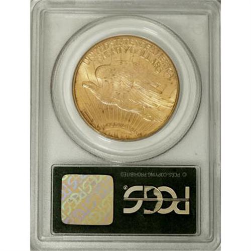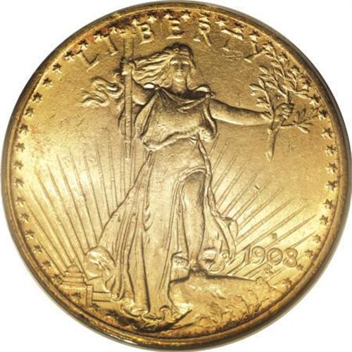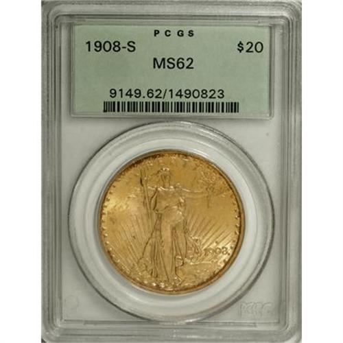<B>1908-S $20 MS62 PCGS.</B></I> The 1908-S is the lowest mintage issue of the Motto Saint-Gaudens type. A scant 22,000 pieces were struck, and attractive Mint State examples are eagerly pursued by the many collectors of this beautiful series. As expected from the MS62 grade, the present coin has a few minor marks on the waist and obverse field, but the obverse is attractive and the reverse is well preserved. The Capitol building is intricately struck, as is Liberty's face, and only the fingers on her torch hand lack decisive definition. Certified in an old green label holder.<BR><BR><B>Coin Engraver:</B> Augustus Saint-Gaudens<BR><BR><b>Shipping:</b> Coins & Currency (<a target="_blank" href="http://www.heritageauctions.com/common/shipping.php">view shipping information</a>)