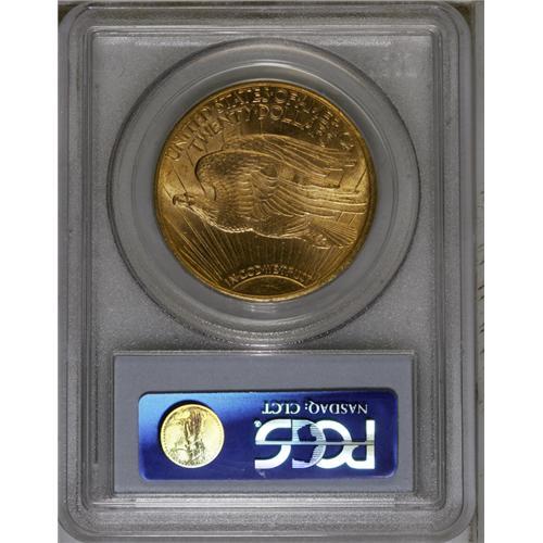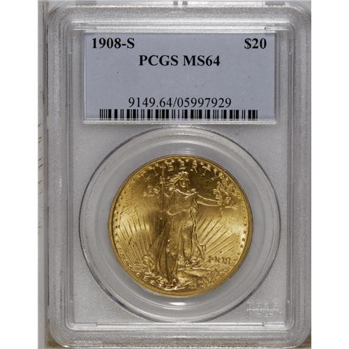 <B>1908-S $20 MS64 PCGS.</B></I> A better date in all grades due to a tiny emission of 22,000 pieces. A majority of survivors are XF to AU, and examples with full mint luster are highly contested on the bourse floor. This boldly struck and attractive near-Gem has a well preserved reverse, and the obverse is also nice with only minor grazes present, mostly near 3 o'clock. Although the glamour dates in the Saint-Gaudens series are the high reliefs and the heavily melted postwar issues, the 1908-S is also a rarity in Mint State. Population: 28 in 64, 26 finer (10/06).<BR><BR><b>Shipping:</b> Coin/Currency (<a target="_blank" href="http://www.heritageauctions.com/common/shipping.php">view shipping information</a>)