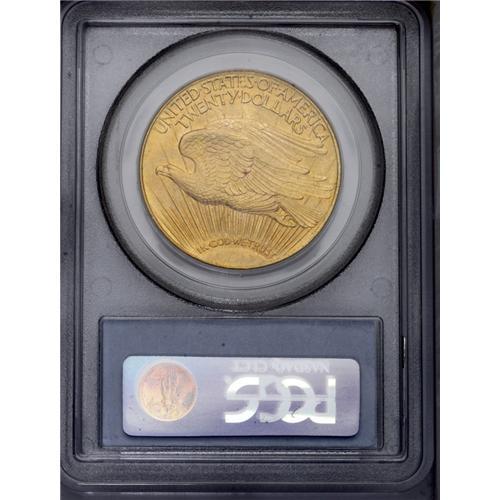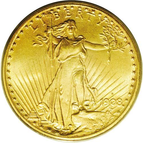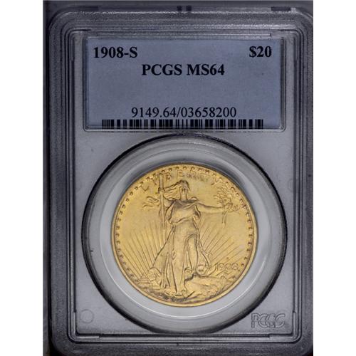 <B>1908-S<$20> MS64 PCGS.</B></I> All San Francisco Mint double eagles of this design type were from the With Motto modification. With a mintage pegged at just 22,000 coins, this issue has the distinction of being the lowest mintage date of all With Motto coins. Although some examples of this date have been returned from overseas, this remains a rare date in all grades. Bowers noted: "No doubt in the early 21st century the price of this desirable variety will stabilize, but at a level reflecting its scarcity." Two years after those words were written, we believe that the price still has not reached its proper price level. This example is an impressive coin, nearly Gem quality, with sharp design definition and satiny orange-gold luster. Population: 26 in 64, 25 finer (3/06). <BR><BR><B>Important notice:</B> Heritage usually auctions material at the rate of 200-250 lots per hour. On some occasions eBay Live bid software or the Internet may not be able to keep up with the pace of the auction. We recommend placing a realistic absentee bid now as insurance to avoid disappointment. Occasionally the auctioneer may eliminate or reject an eBay Live bid, and the auctioneer may also reopen a lot after the close of the eBay live bidding (usually because we missed an audience bid), and may reject your bid even if it shows you as the winning bidder. By bidding via eBay Live, you agree that Heritage may award the lot to another bidder at its sole discretion under the circumstances described above or any other reasonable circumstances. Since eBay bids are not shown to us until we open the lot on the floor, we treat those bids just like floor bids. In most cases the floor responds before the eBay bid is presented to us, due to Internet lag time, so for consistency we have made it a policy that floor bids are always considered first over tie eBay live bids. Also please note that all Heritage lots purchased through eBay Live carry a 20% Buyer's Premium. Please make sure you read the Terms and Conditions before you bid. This lot is being auctioned in conjunction with a live floor auction by Heritage Galleries & Auctioneers. All final auction and invoice information will be supplied by Heritage Galleries & Auctioneers, and all other information should be considered preliminary. Lot:4571 <BR><BR><B>Winning Notification and Billing:</B> After the FINAL session in this auction is complete, Heritage will send e-mail and snail mail invoices. This process normally takes several days. All final auction and invoice information will be supplied by Heritage Galleries & Auctioneers, and all other information should be considered preliminary. <BR><BR>This auction will be conducted on a live auction floor and over the Internet through eBay Live. If you choose to place an absentee bid, please take a moment to <font color='#0000ff'><u><a href='http://pages.ebay.com/liveauctions/help/before/laabsentee.html'>learn how eBay Live absentee bidding works</a></u></font><font color='#000000'>
