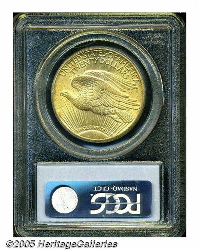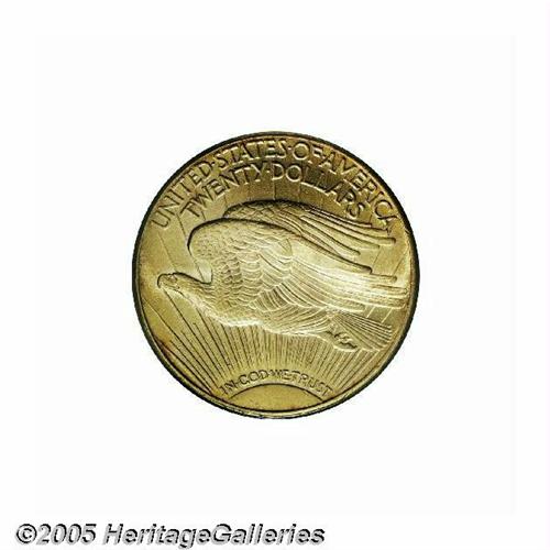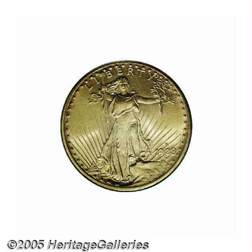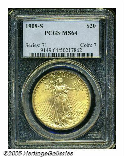 <B>1908-S<$20> MS64 PCGS.</B></I> The 1908-S is one of the rarest issues in the Saint-Gaudens series. Not only does it have a very low mintage of only 22,000 pieces (second only to the 1907 High Relief), but it is also scarce in all grades. In Mint State, though, the 1908-S is especially difficult to locate. 1908-S Twenties have a reputation for always being sharply struck, and so it is with this piece. The surfaces show the soft, frosted luster usually seen, and there are virtually no marks visible on either side. In fact, one might wonder why this escaped the coveted MS65 grade. One of the finest we've handled and certain to bring a premium bid. Population: 26 in 64, 24 finer (5/05).