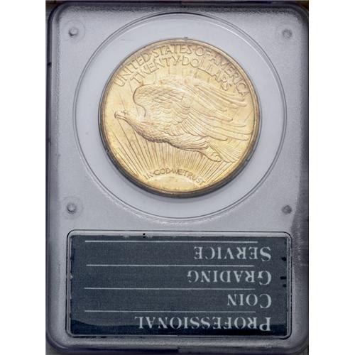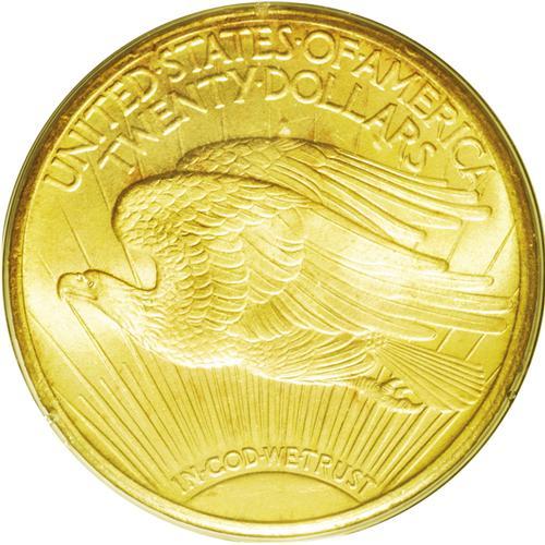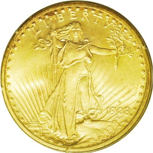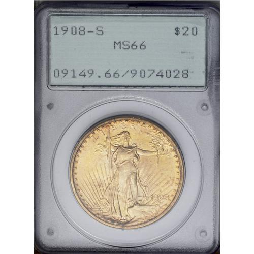 <B>1908-S<$20> MS66 PCGS.</B></I> An important date in the Saint-Gaudens double eagle series, and this example is nearly the finest available quality. It is housed in a first-generation PCGS holder, and the quality is exceptional for the grade. This issue is the first San Francisco Mint issue of the design, and representative of the first year for the new sub-type with the addition of the motto IN GOD WE TRUST on the reverse. There were no S-Mint examples of the No Motto type produced. Both sides are sharply detailed with pristine yellow-gold surfaces and frosty luster. Deeper orange toning is visible at the rims, and a few splashes of coppery toning are also evident. This is an aesthetically desirable example of an issue that is usually quite attractive. David Akers noted: "In top grade, this is one of the prettiest issues of the series."<BR> Akers further commented: "The 1908-S is a rare issue in Mint State grade. This is one of those relatively few Saint-Gaudens issues that is seen much more often in the circulated grades than in Mint State. Most Mint State specimens are rather low quality, i.e. in the MS-60 to 62 range. At the MS-63 level or above, this issue is really rare." The rarity of this issue is explained in part by the low mintage of just 22,000 coins. Aside from the various High Relief issues, this is the lowest production of any 20th century double eagle. Current population reports (5/06) suggest that this is one of nine similarly graded coins certified by PCGS, with four others in the higher MS67 grade. Our suspicion is that these 13 submissions represent less than 10 actual coins.