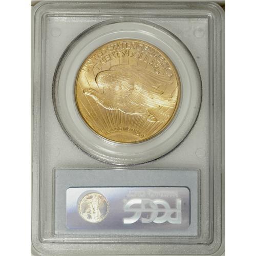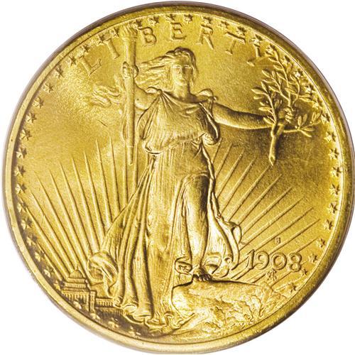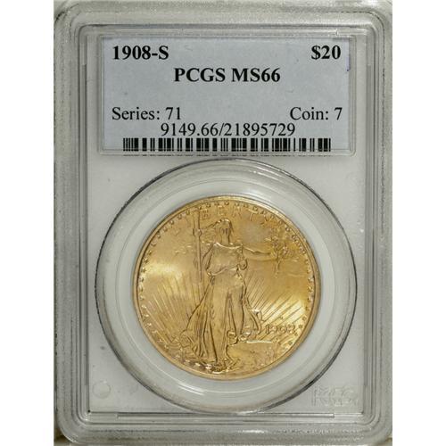 <B>1908-S $20 MS66 PCGS.</B></I> The 1908-S, with a mintage of only 22,000 pieces, has the lowest production of any issue in the Saint-Gaudens series except for the Ultra High Relief and High Relief. Roger Burdette's mint archival research sheds light on reason's for this low mintage: "San Francisco was the last mint to receive dies and collars for the new double eagles. Blueprints were sent from Philadelphia on March 17 and a month later it was discovered that the presses did not have enough clearance to allow the edge collar mechanism to operate. Once the dies were on hand, the mint still had considerable difficulty in adapting their presses to the segmented edge collar. It wasn't until September 10 that double eagles again flowed from the western mint, but they managed to produce only 22,000 of the new coins by year's end."<BR> As with some other San Francisco dates, but unlike many other Saint-Gaudens issues in general, there was apparently an effort to place 1908-S twenties into the channels of commerce, as a larger number of circulated examples than Uncirculated ones are in the marketplace (in this regard, it is instructive to note that PCGS and NGC have to date certified about 460 circulated specimens and approximately 240 Mint State coins). Most Uncirculated pieces grade through MS64. Fewer than 20 Gems are known, and just about 15 Premium Gems and five Superb Gems have been certified.<BR> The MS66 representative we present here displays the thick mint frost and rich orange-gold color that are typical of this issue. Further enhancing the coin's eye appeal is the well-executed strike that manifests itself in the sharply defined features of Liberty, the Capitol building, and the eagle. Much of this sharpness of detail likely comes from a strengthened obverse hub that is seen on twenties beginning with the 1908 With Motto issue. Both sides of this lovely example are impeccably preserved, and reveal no flaws that might be considered detracting. We simply point to a minute mark in the field beneath Liberty's flowing hair and another at the top of the ray closest to her left (right facing) breast, both of which may help to identify the coin.<BR><I>From The Kutasi Collection.</B></I><BR><BR><b>Shipping:</b> Coin/Currency (<a target="_blank" href="http://www.heritageauctions.com/common/shipping.php">view shipping information</a>)