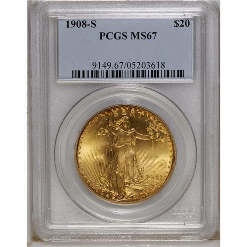 <B>1908-S $20 MS67 PCGS.</B></I> This piece is tied for the finest certified by PCGS, and it is one of the most important coins in the present sale. All 1908-S double eagles, and only 22,000 were actually struck, represent the newly modified With Motto design type. Jeff Garrett and Ron Guth wrote about every U.S. gold coin issue in their 2006 <I>Encyclopedia of U.S. Gold Coins,</B></I> commenting:<BR><BR>The 1908-S issue is the first truly low-mintage issue. As with most San Francisco coinage of the period, the coins are awash in satiny luster and decent strikes. Positional differences have been observed in the location of the mintmark, and at least two obverse dies were used to coin this limited issue. A total of 537 pieces at the time of publication have been graded between ANACS, NGC, and PCGS, the vast majority in circulated or very low Mint State grades. Obtaining an example as high as MS-63 is quite a challenge for date collectors, with approximately 100 examples certified as MS-63 or finer. The finest examples known are four coins now five graded MS-67, all by PCGS. In terms of the entire series, this date ranks as the 14th rarest of the 54 dates and mints."<BR><BR> It is instructive to compare these comments written in 2006 with the comments by David Akers a quarter century ago: "With the sole exception of the 1907 High Relief, the 1908-S has the lowest mintage of any regular issue Saint-Gaudens double eagle. Therefore, it is not surprising that the 1908-S is a scarce date in all grades. In Unc. it is one of the rarest dates in the entire series and it actually had fewer Unc. auction appearances in my survey than any date in the series other than the 1933, 1927-D, 1921, 1920-S, and 1931-D. Most 1908-S twenties are in the circulated grades, fairly evenly spread between VF, EF, and AU. Average quality Uncs. are very scarce and Choice or Gem quality pieces are rare." For all practical purposes, the 1982 comments by David Akers and the 2006 comments by Garrett and Guth are the same. The available supply of Gem quality examples of the 1908-S double eagle have remained constant over 25 years.<BR> On this example, the mintmark is well above the left curve of the 0 in the date and leans slightly to the left. It appears to be from the same punch that was used for the much smaller diameter 1909-S VDB cents with a small chip inside the upper curve. Both sides are fully detailed with frosty gold luster and considerable pale orange toning at the borders. Additional coppery toning is evident on both sides. The surfaces are virtually perfect with only the slightest abrasions visible with magnification. Population: 5 in 67, 0 finer (10/06).<BR><BR><b>Shipping:</b> Coin/Currency (<a target="_blank" href="http://www.heritageauctions.com/common/shipping.php">view shipping information</a>)
