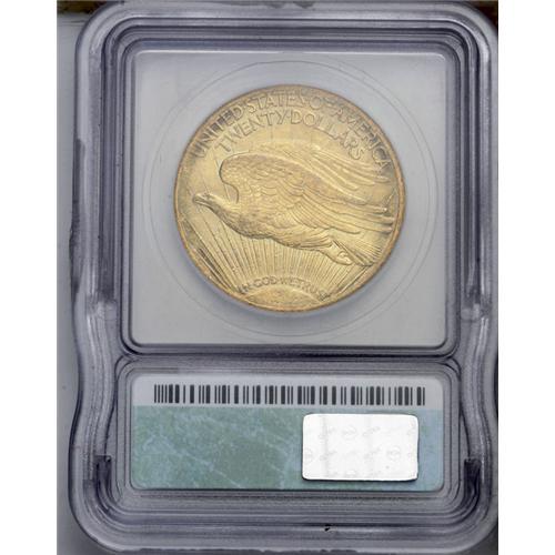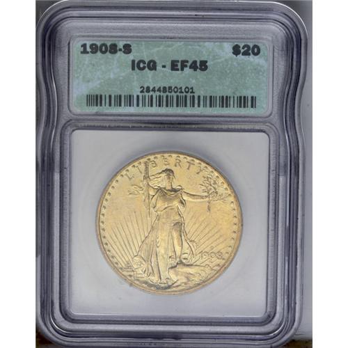 <B>1908-S<$20> XF45 ICG.</B></I> This Choice XF 1908-S displays attractive apricot-gold patina with accents of light green. Wisps of luster are apparent in the protected areas, and the design elements retain excellent definition. Minor contact marks scattered about do not distract.
